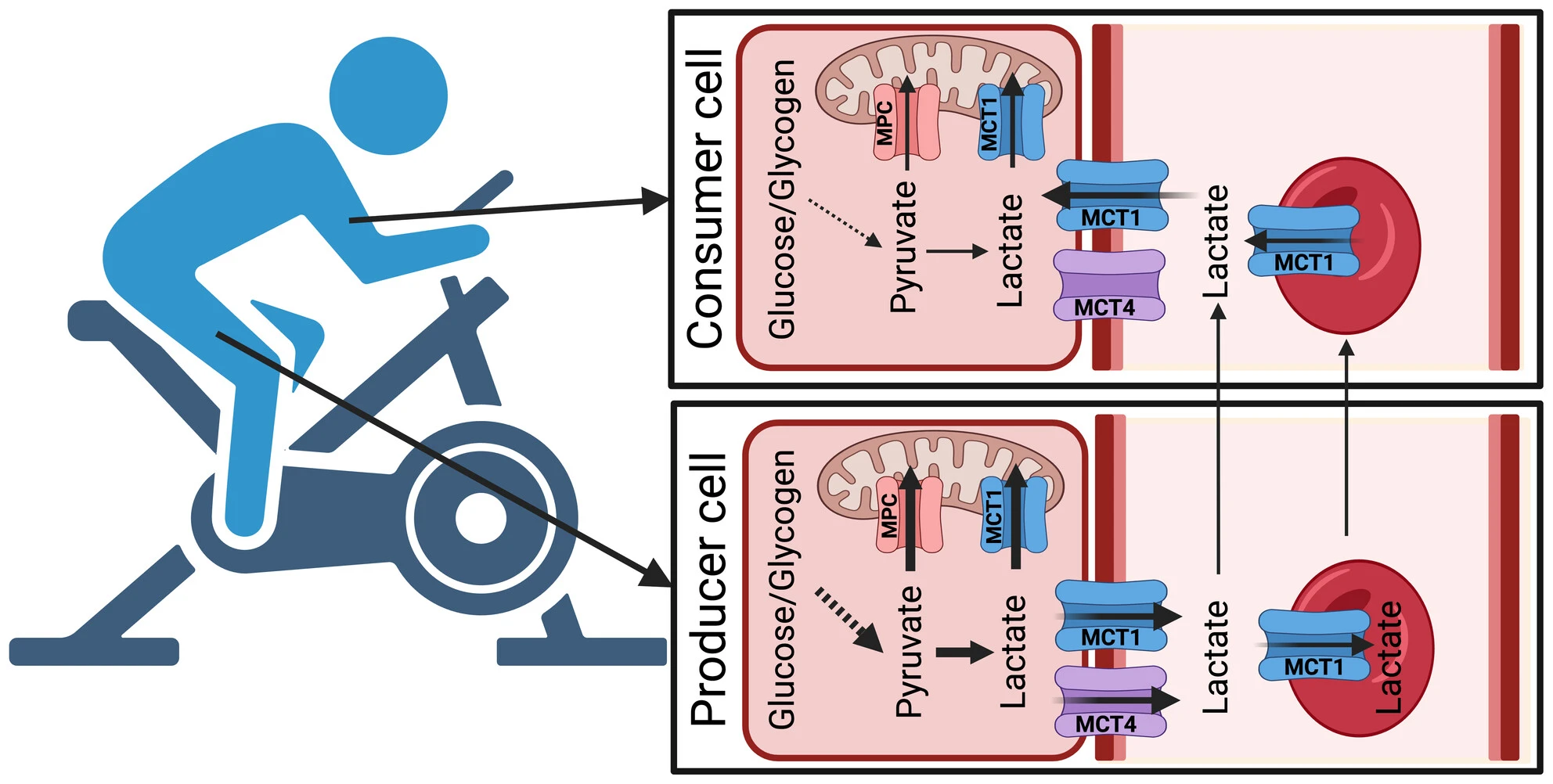 Unser Körper produziert 24/7 Laktat, es wird kontinuierlich transportiert und von verschiedenen Geweben wiederverwendet wie beispielsweise von Herz, Gehirn und gut trainierten Muskeln. Die sogenannte Lactate-Shuttle-Theorie beschreibt diese ständige Weitergabe von Laktat als Energiequelle.